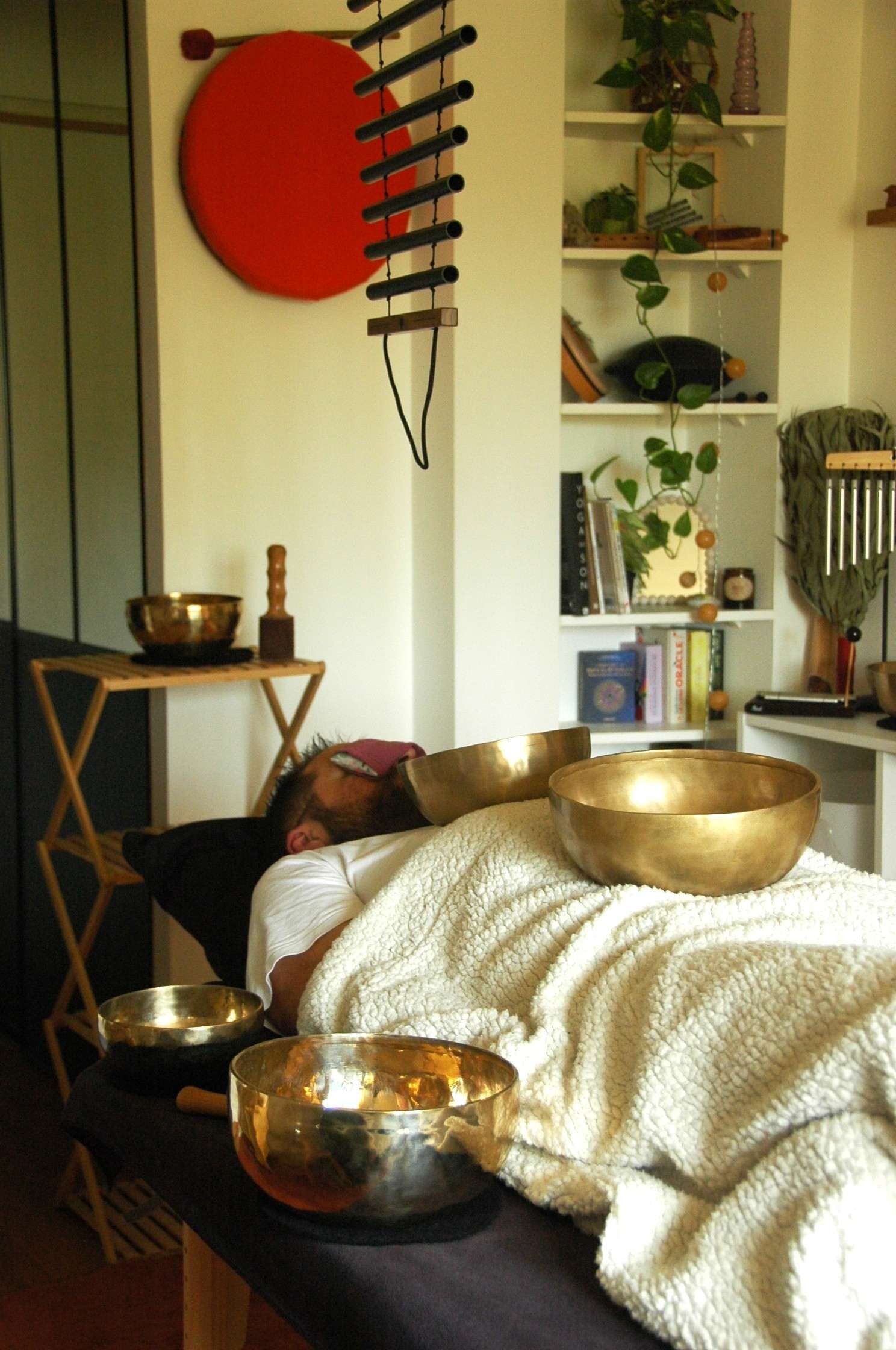 Certains sons sont joués autour de vous et certains bols sont posés sur vous pour bénéficier de leurs vibrations qui viendront masser le corps.