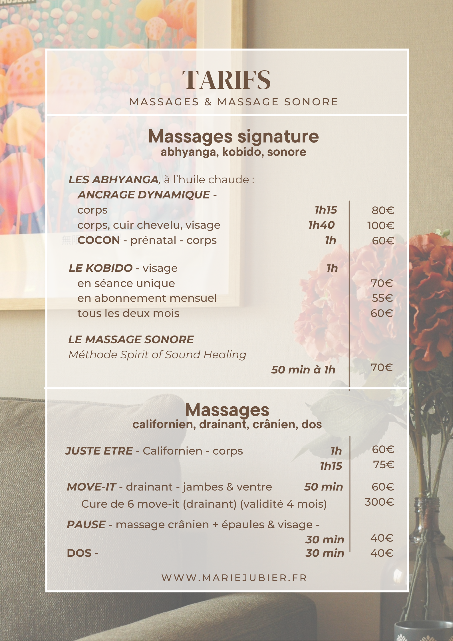 sur les pages dédiées à chaque massage.